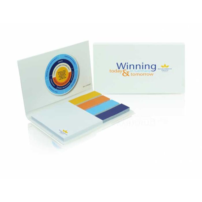 Selbstklebe- und Registerblätter im Notizbuch mit 50 Seiten. Das Softcover bietet Schutz für den Inhalt und Platz für die Marketingbotschaft. Anzahl der Zettel – selbstklebende Zettel: 50, Registerzettel: 20, Druck 1–4 Farben (außer Folienregisterzettel). Laminierter Einband.