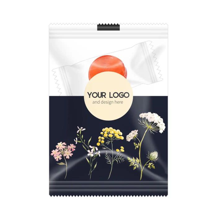 Mini candy bag filled with 12 g of fruit candies. Each bag contains 3 juicy candies in transparent film with flavors: strawberry, orange, apple and lemon. Eco-friendly packaging: 100% compostable foil. Candies optionally made with chicory sugar, added fruit juices or sugar-free version. Packaging film color: white or transparent. Bag dimensions: 87 x 70 mm. Minimum order: 1500 pcs. Expiry date: 12 months. Printing option: flexo printing. Candy bag mini is a handy and practical promotional product with great potential. We personalize the bag with your logo or graphics, making it a sweet corporate gift. Ideal for events, openings, trade shows or customer days.