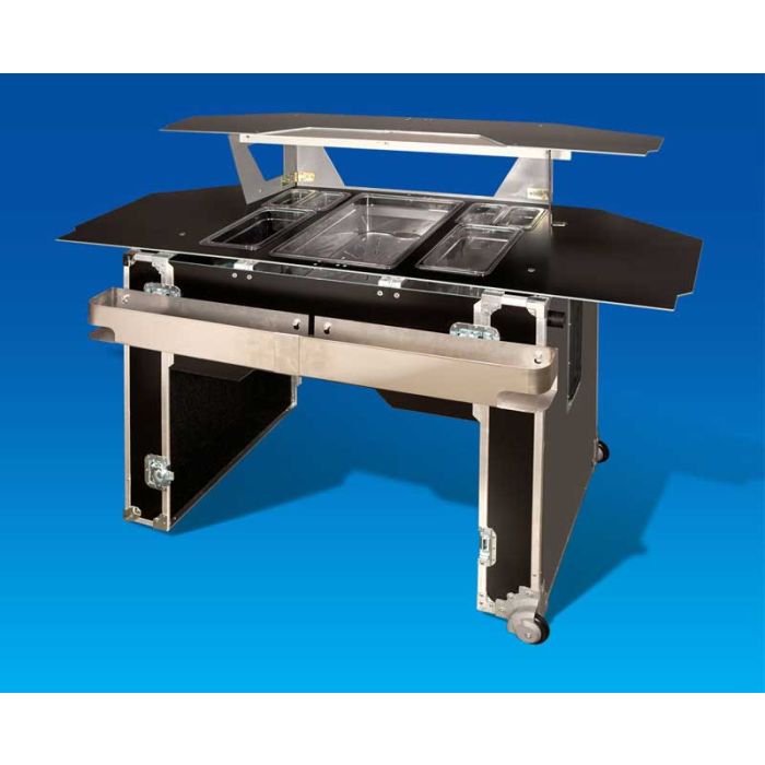Reduce queues and increase sales. The mobile Casebar® allows you to prepare an additional cocktail or bar corner in the event of an expected high number of visitors in your inn, or to serve drinks at different ends of a party, bar or other event.The mobile Casebar® is equipped with a 1380 mm wide serving area and a preparation bar with a width of 1580 mm.The bar has 4 small containers (176x108 mm), 2 medium-sized containers (176x325 mm) and 1 large container (530x325 mm).Casebar® folds into a cheeky case with a total weight approx. 33 kg. Entertainment becomes fully mobile with this fully functional bar station. The case is equipped with special rubberized wheels for easier transport.For you, we can print the mobile Casebar® with your logo, slogan or other advertising, which gives you additional value on the product.The mobile bar is made of double anodized aluminum , and its properties are extreme durability (up to 100 kg without bending) and lightness.Ask for personalization prices.Casebar® is made to order, delivery time approx. 3 weeks after order confirmation.