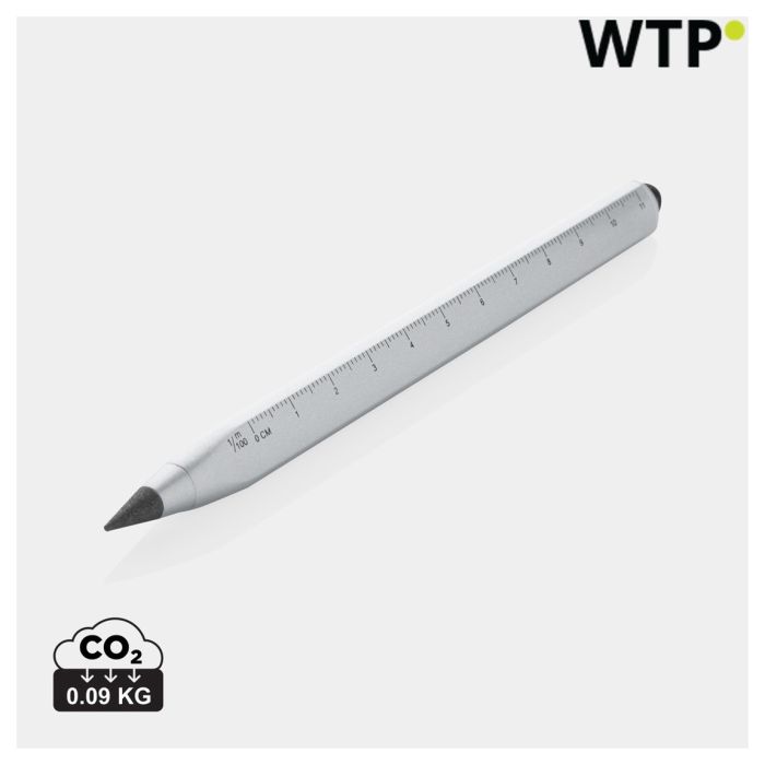 Modern infinity pen made with RCS certified recycled aluminum. Total recycled content: 40% based on total item weight. RCS certification ensures a completely certified supply chain of the recycled materials. Triangle shaped body with CM indication on one side and Inches on another side. Traditional wooden pencils write only up to around 200 metres but this Tree free infinity pencil, has a writing length of up to around 20000 metres using a graphite tip to produce a graphite line. Not only does it write like a pencil, but the markings can be erased. It works by leaving a graphite line on paper just like a regular traditional wooden pencil but it wears down so slowly, that it should outlast up to 100 traditional wooden pencils! With touch tip to operate mobile device. Packed in FSC® mix packaging.
