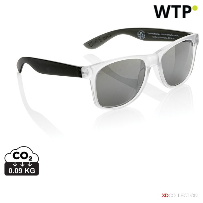 Sunglasses made with RCS certified recycled transparent PC frame. With colored mirrored lenses. Total recycled content: 72% based on total item weight. RCS certification ensures a completely certified supply chain of the recycled materials. The lenses are conform EN ISO 12312-1, UV 400 and CAT 3. Packed in a FSC® kraft box.