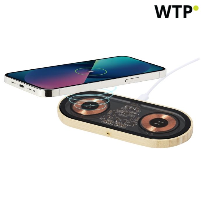 Presentiamo la soluzione definitiva per individui e aziende esperti di tecnologia: il Caricabatterie Wireless Dual da 15W. Questa innovativa stazione di ricarica non solo presenta un design elegante e moderno, ma enfatizza anche la sostenibilità con la sua base in bambù, rendendola una scelta ecologica per regali promozionali e aziendali.