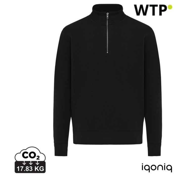 Maglione unisex a maniche lunghe con zip a tre quarti, moderno, realizzato in cotone al 100%, di cui il 30% riciclato e il 70% organico, con peso di 300 G/M², con colletto in tessuto, maniche lunghe inserite, polsini e orlo a coste 1x1, interno in French terry, garantito con materiali autentici riciclati e organici e riduzione dellimpatto ambientale grazie alla tecnologia AWARE™ e blockchain, scansionando il QR code si accederà a un passaporto digitale dedicato, il 2% delle entrate di ogni prodotto venduto sarà donato a Water.org, certificato OEKO-TEX® STANDARD 100 Centexbel, con possibili impurità e variazioni di colore a causa della natura delle lane riciclate.