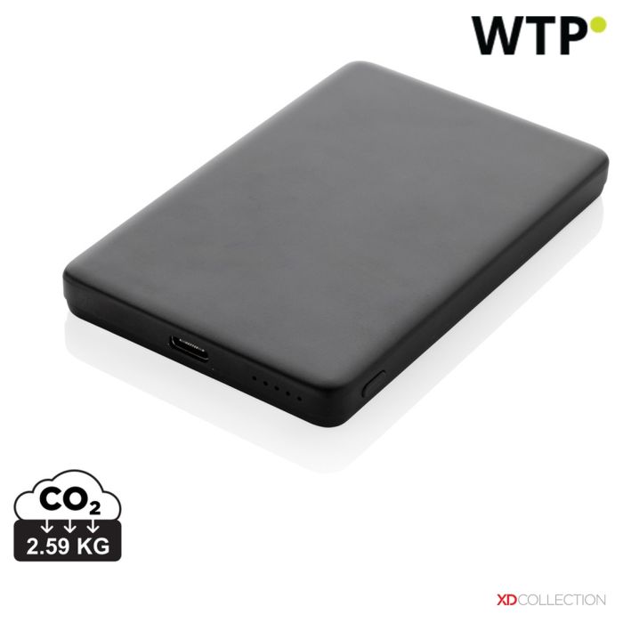 Powerbank ultrasottile da 5.000 mAh con caricatore wireless magnetico da 5W, in lega di alluminio riciclato certificata RCS e plastica ABS riciclata, con batteria in polimero di litio di grado A da 5.000 mAh a lunga durata, indicatori di livello energia, input Type-C 5V/2.4A, output USB C 5V/2A/4A, senza PVC, con cavo di ricarica TPE riciclato certificato RCS, imballaggio misto FSC®.
