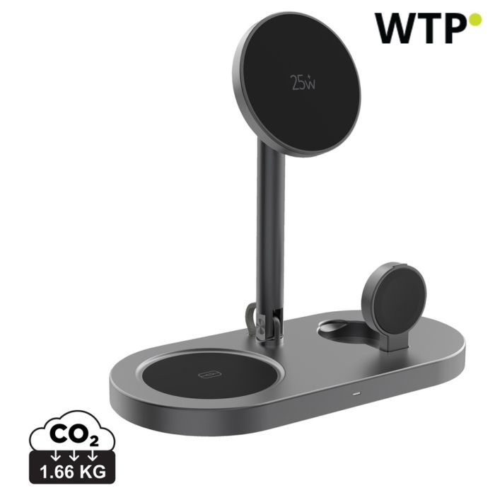 Experience ultra-fast 25W magnetic wireless charging with Quantum Ultra-Fast 3-in-1, the sleek desktop charger that powers your phone, Apple Watch/Samsung Watch, and earbuds simultaneously. Its efficient system delivers stable charging across all devices, supported by advanced safety and temperature protection for reliable everyday use. Made from RCS certified recycled ABS, recycled aluminium, and recycled PC. RCS (Recycled Claim Standard) verifies the recycled content throughout the supply chain. Total recycled content: 47% based on total item weight. The USB-C input ensures consistent energy delivery for optimal 25W output, and the item and accessories are PVC-free and packed in FSC® mix kraft packaging. Including a 120 cm USB-C to USB-C cable made from RCS-certified recycled TPE. Minimum input: 9V/3A for optimal use.