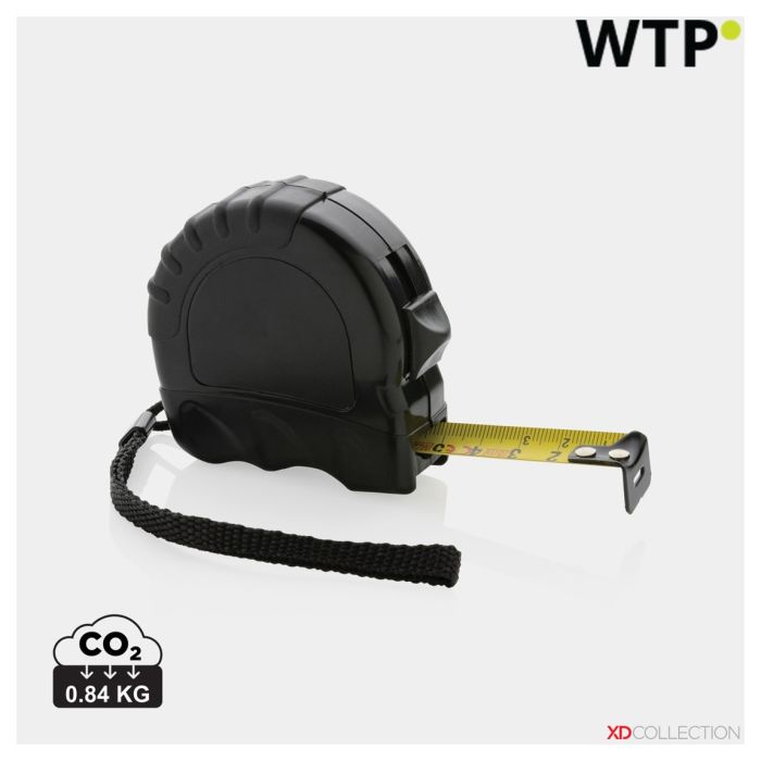 Metro da 5 metri realizzato in ABS riciclato certificato RCS (Recycled Claim Standard). Contenuto totale riciclato: 17% basato sul peso totale dellarticolo. La certificazione RCS garantisce una catena di fornitura completamente certificata dei materiali riciclati. Con impugnatura in gomma TRP deluxe per una presa fluida. Con pulsante di rilascio/blocco. Con nastro monofacciale da 19 mm, giallo con gancio in acciaio al carbonio nero. Con cinturino in poliestere. Imballato in confezione kraft mix FSC®.