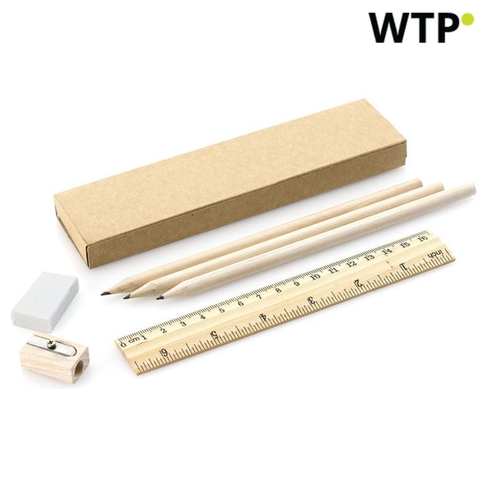 Ogni set include: tre matite di legno realizzate con materiali naturali, un righello da 20 cm contrassegnato sia in centimetri che in pollici per un uso versatile, una gomma affidabile e un pratico temperamatite. Tutti gli articoli sono confezionati ordinatamente in una scatola di cartone riciclato, a testimonianza del tuo impegno per la responsabilità ambientale.