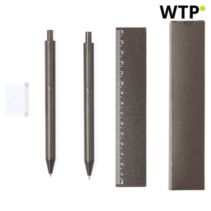 Presentiamo il set di scrittura ecologico definitivo che non solo soddisfa le tue esigenze di scrittura quotidiana, ma promuove anche la sostenibilità. Questo regalo promozionale e aziendale è perfetto per le aziende che desiderano migliorare la visibilità del proprio marchio mentre fanno un impatto positivo sullambiente. Il set include una penna a sfera con inchiostro blu, una matita meccanica dotata di due mine da 0,7 mm, un righello da 15 cm e una utile gomma, il tutto elegantemente presentato in un elegante astuccio in fibra di caffè.