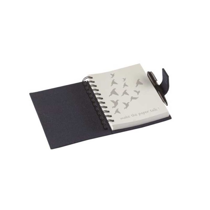 Praktični zvezek s spiralo in platnico narejeno iz filca ter zapiranjem na velcro. Pri strani elastika za pisalo. Platnica je lahko narejena iz standardnih barv filca. Število listkov - zvezek: 110. tisk 1-4 barve. Na platnico tiskamo s sitotiskom. Izdelek je na voljo tudi v formatu A4 (izdelek WTP757_A4) in A6 (izdelek WTP757_A6).