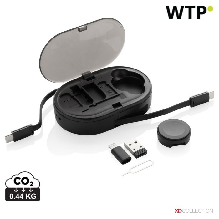 The Chargevix RCS Multi-functional retractable charging cable set offers versatile charging and data transfer for multiple devices in a compact and organised design. The matte black case with a transparent lid houses a retractable cable of 80 cm and includes connectors for USB-C, USB-A, Micro, and Lightning, supporting data sync functions as well as CarPlay and Android Auto. Power delivery is optimised with 60W via USB-C to USB-C—suitable even for charging laptops—and 12W for USB-A to USB-C, USB-C to Lightning, and USB-C to Micro connections. Additional features include a SIM card removal pin, memory card slot, SIM card slot, phone holder, and an Apple Watch charger. Made out of RCS certified recycled materials. RCS (Recycled Claim Standard) is a standard to verify the recycled content of a product throughout the whole supply chain. Total recycled content: 51 % based on total item weight. Item and accessories are PVC-free and packed in FSC® packaging.