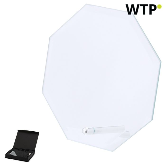 Ta osupljiva plaketa ni le dekorativni kos služi kot simbol dosežka in priznanja, kar jo naredi za idealno izbiro za korporativne nagrade, priznanje zaposlenih ali promocijska darila. Izdelana iz visokokakovostnega stekla, njen eleganten osemkotni dizajn dodaja pridih sofisticiranosti vsakemu okolju, kar zagotavlja, da izstopa kot osrednji kos.