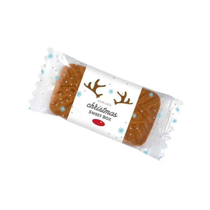 Božični piškot z okusom karamele in začimb (5,5 g), pakiran posamično v belo ali prozorno embalažo iz mono folije (kompostabilna ali reciklabilna). Odličen kot dodatek v prazničnih darilnih kompletih. Dimenzije: 90 × 40 mm. Flexo tisk na folijo. Min. naročilo: 2000 kosov. Rok uporabe: 6 mesecev. Opomba: Zaradi naravne sestave se piškoti lahko zdrobijo – to ne vpliva na kakovost ali okus.